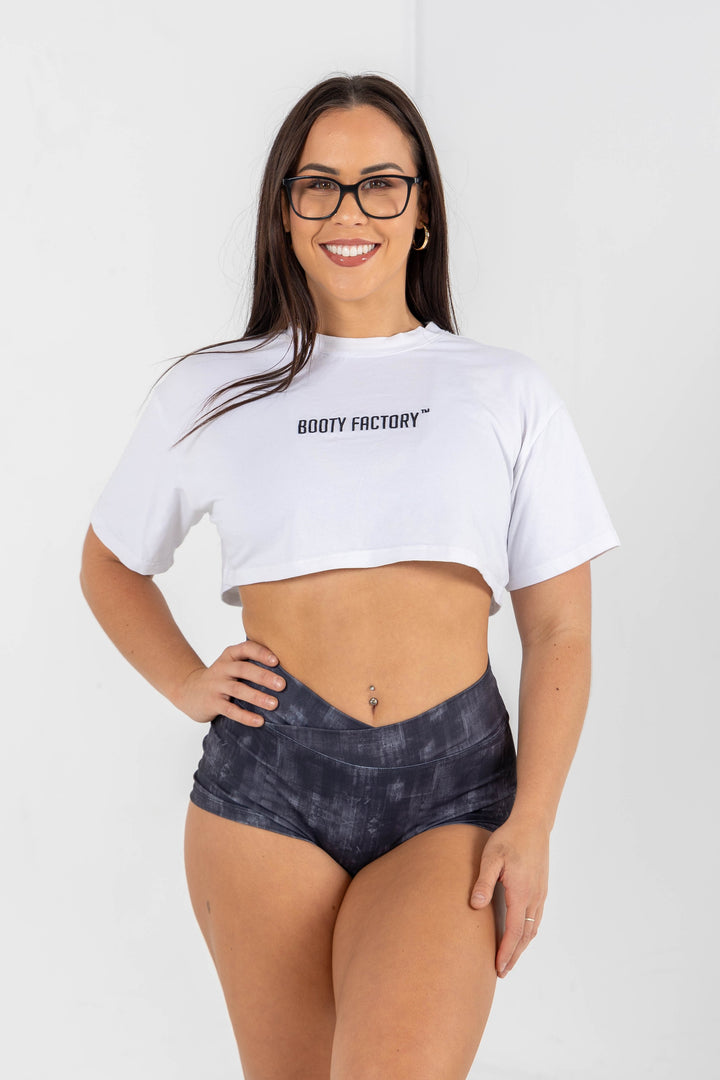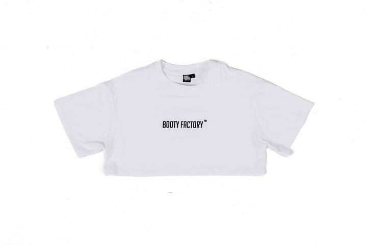 Our signature Embroidery Crop Tee in white feels super soft and it finishes at the bottom with a stitched hem.