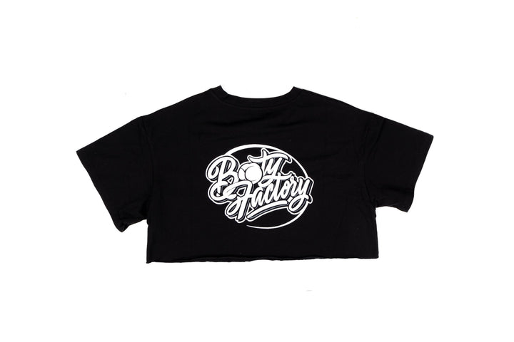 Our original raw edge crop tee with our Booty Factory logo on the back, plain on the front.
