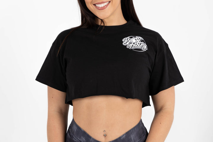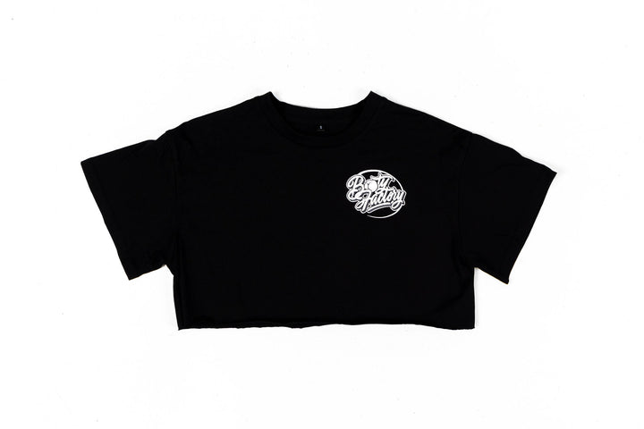 Rep Booty Factory proudly on your chest with this cute raw edge crop. Booty Factory OG logo on the front, with a plain back.